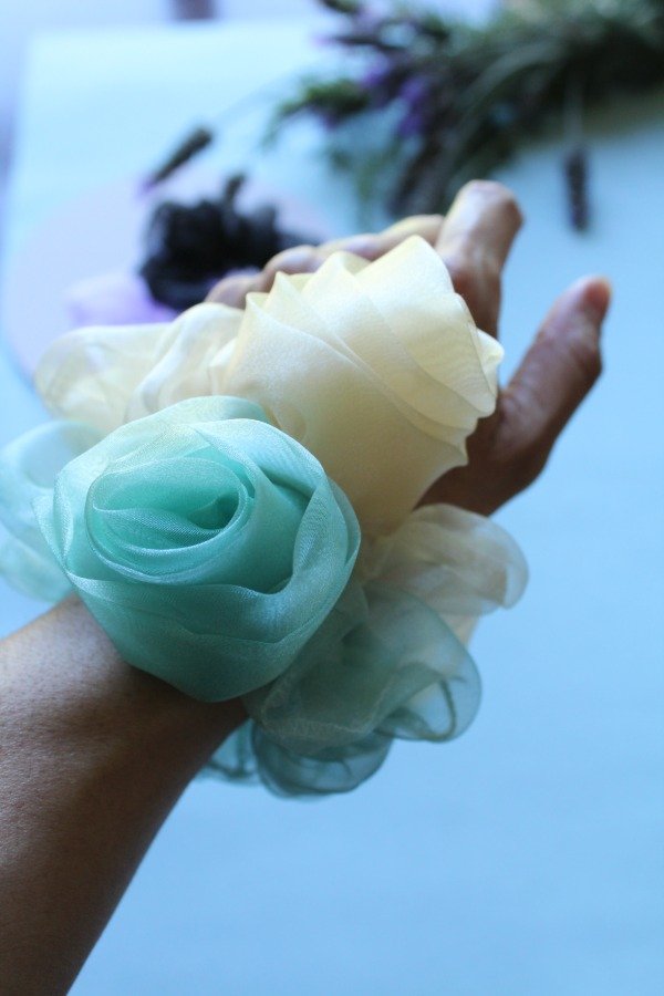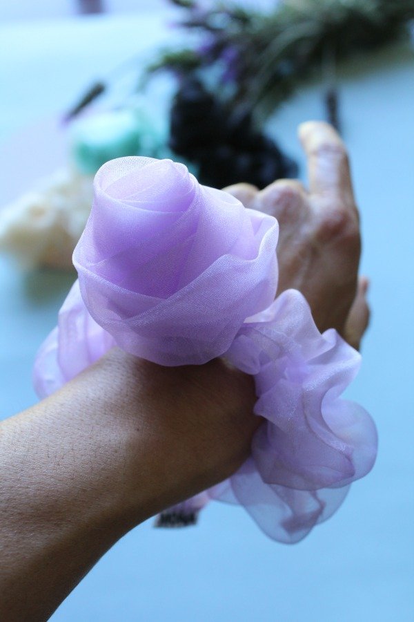 Las vas a amar! Es una scrunchie clásica en gasa cristal con una flor mediana!